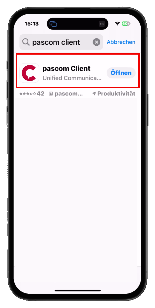 Installieren Sie Sie zunächt die Pascom Mobile App kostenlos über den App Store von Apple / Playstore von Google auf Ihrem Smartphone oder Tablet . Eine Suche nach Pascom Client zeigt Ihnen folgendes Ergebnis.