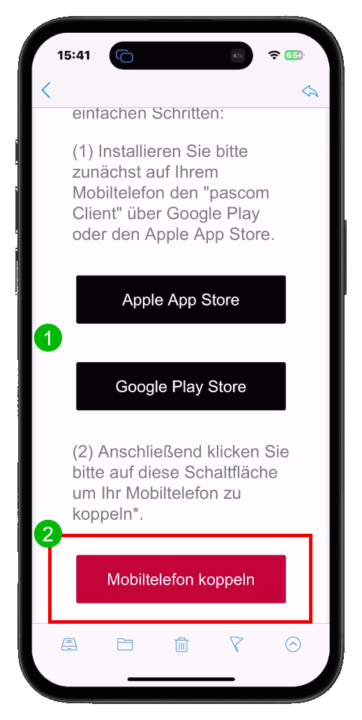 In der E-Mail werden Sie nochmals aufgefordert, die App zu instalieren (1). Falls das noch nicht geschehen ist, können Sie auch jetzt noch erledigen. Klicken Sie danach auf die rote Schaltfläche (2) "Mobiltelefon koppeln"