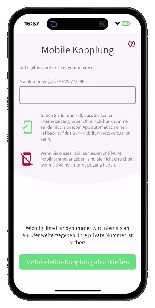 Optional können Sie nun noch Ihre Mobiltelefonnummer im E.164-Format +491xxxxxx eintragen. Die Nummer wird nicht übertragen, sorgt jedoch dafür, dass in den Fällen, wo Sie eine unzureichende Internetverbindung auf dem Smartphone haben, trotzdem gut erreichbar bleiben, weil der Anruf dann automatisch über das Mobilfunknetz geroutet wird.