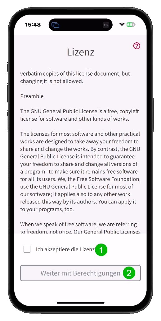 Jetzt müssen noch die erforderlichen Berechtigungen erteilt werden. Die App zeigt Ihnen an, welche Berechtigungen erforderlich sind für eine korrekte Funtion. Durch Anklicken der grünen Schalfläche