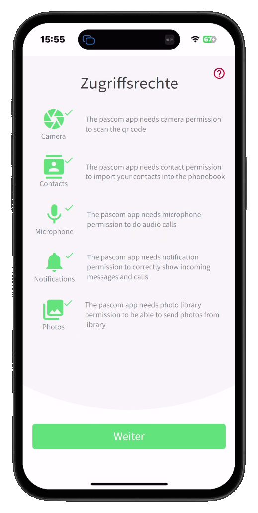 Weiter Berechtigung erteilen erhalten Sie verschiedene Berechtigungsanfragen, denen Sie mit Ausnahme des Telefonbuchzugriffs auch zustimmen müssen für eine ordnungsgemäße Funktionalität.