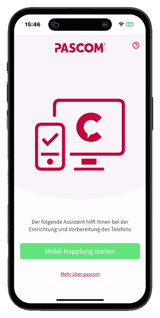 Klicken Sie auf Koppeln. Nun wird die Pascom App gestartet und Sie können mit Klicke auf die grüne Schaltfläche Mobil-Kopplung starten fortfahren.